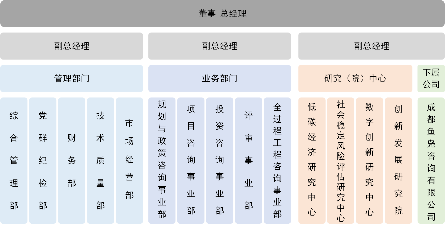 公司本科及以上學歷員工占比93%,碩士及以上學歷員工占比47%;正高級工程師7人,高級工程師28人,擁有全國咨詢工程師(投資)、全國注冊造價工程師以及注冊城鄉(xiāng)規(guī)劃師等各類專業(yè)技術資格人才占比超過65%。公司下設11個部門,4個研究(院)中心。其中,業(yè)務部門6個,包括規(guī)劃與政策咨詢事業(yè)部、項目咨詢事業(yè)部、投資咨詢事業(yè)部、評審事業(yè)部、造價咨詢事業(yè)部和項目管理事業(yè)部;4個研究(院)中心分別為低碳經濟研究中心、社會穩(wěn)定風險評估研究中心、數字化創(chuàng)新研究中心和創(chuàng)新發(fā)展研究院。為推動行業(yè)數字化、智能化轉型發(fā)展,公司還與西南交通大學經濟管理學院共建工程咨詢智能決策研究中心和產學研合作示范研究基地。公司現有控股子公司1家,為公司與溫江區(qū)屬國有公司合資成立的成都魚鳧咨詢有限公司。