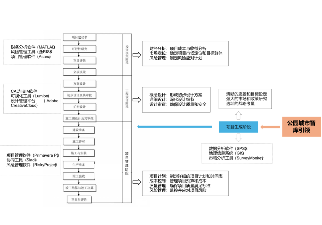 筆者所在的全咨服務(wù)單位是支撐成都市委、市政府建設(shè)踐行新發(fā)展理念的公園城市示范區(qū)的智庫(kù)單位。全咨服務(wù)單位在深入探索全咨模式的過(guò)程中,創(chuàng)新性地采取了以智庫(kù)為引領(lǐng)的策略,特別是在項(xiàng)目謀劃階段,充分發(fā)揮了全咨服務(wù)單位作為“公園城市新型智庫(kù)”的核心作用,立足成都建設(shè)踐行新發(fā)展理念的公園城市示范區(qū)戰(zhàn)略背景,聚焦公園城市建設(shè)發(fā)展機(jī)遇,在理論探索、理念更新、實(shí)踐創(chuàng)新、場(chǎng)景營(yíng)造等多個(gè)方面深入探索,構(gòu)建了一套符合地方特色的全咨模式,將全過(guò)程工程咨詢的服務(wù)周期進(jìn)一步延伸為“項(xiàng)目生成—項(xiàng)目決策—施工準(zhǔn)備(勘察設(shè)計(jì)—招標(biāo)采購(gòu))—工程施工—竣工驗(yàn)收—運(yùn)營(yíng)維護(hù)”(如圖1)。