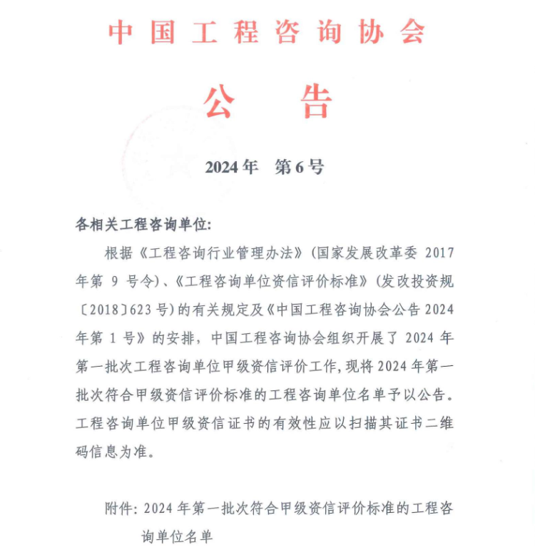 近日,成咨公司順利通過中國工程咨詢協(xié)會2024年第一批次工程咨詢單位甲級資信評價,再次成為四川省唯一同時持有工程咨詢甲級綜合資信、PPP甲級專項資信和甲級專業(yè)資信的綜合性咨詢機(jī)構(gòu)。